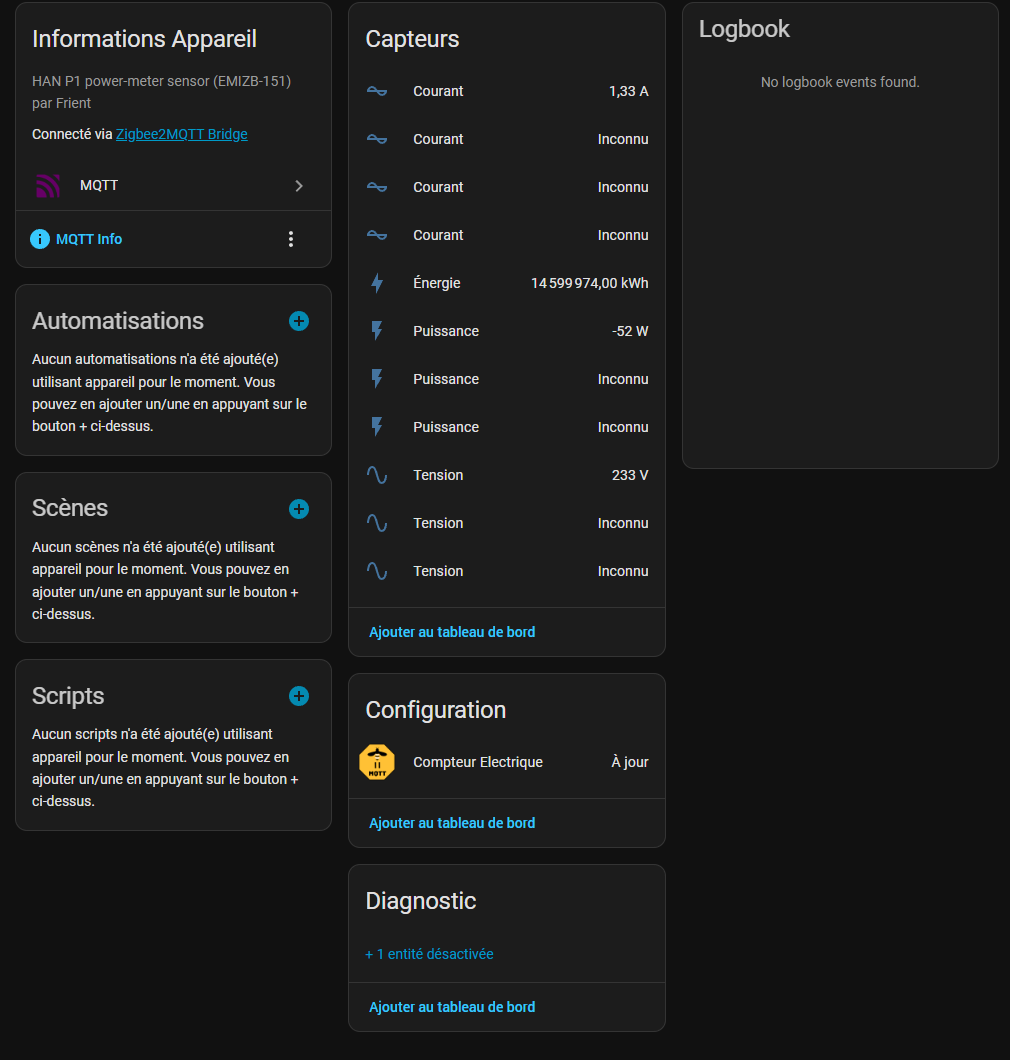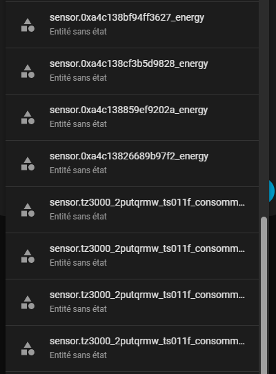 Je l’ai enlever d’Energie, j’ai refait un nouvel appairage, je l’ai mis a jour (plus sur si c’était avant ou après) mais a chaque fois 0 évolutions de l’énergie en KWh. Je l’avais retirer de nouveau d’énergie et je ne l’ai remis qu’il y a deux jours mais rien !