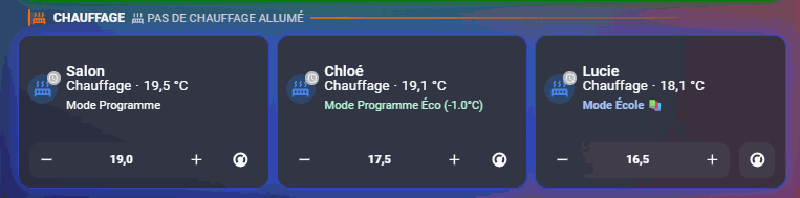 Plutôt que de multiplier les configurations, j’ai choisi une logique unique qui s’applique à toutes les pièces, avec des labels dynamiques pour refléter l’état réel du chauffage :