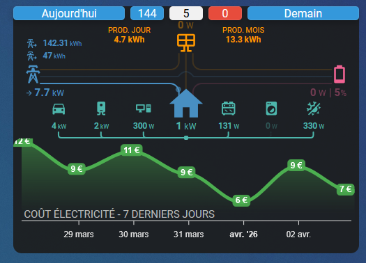 2. Production solaire du jour et du mois intégré à la carte du dessous au point que les infos ont l’air d’en faire partie !