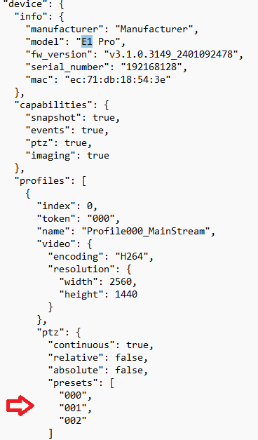 puis rechercher dans le fichier « Onvif » et le nom de ma caméra « E1 Pro » pour moi et PTZ avec les noms des presets