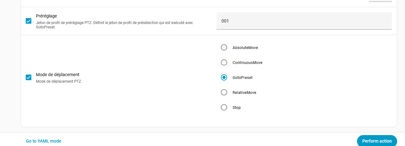 cocher GotoPreset puis cliquer sur Perfom action pour voir si ça fonctionne