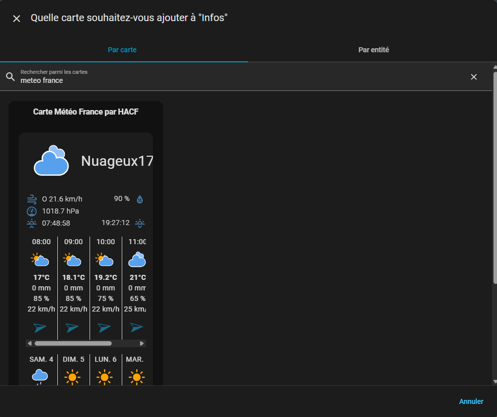 Je ne sais pas où trouver cette “Carte Météo France par HACF”. Ou bien le nom a changé. Ensuite comment fait-on pour la choisir, puis la configurer ?