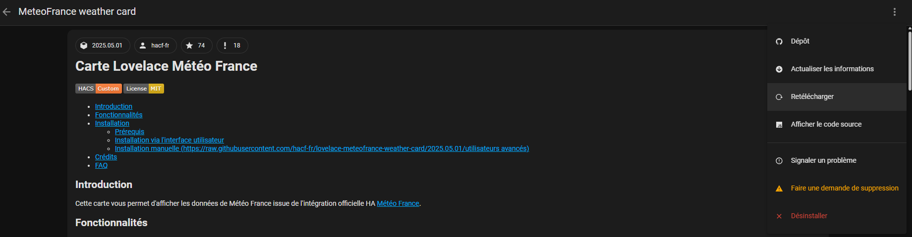 J’ai changé de navigateur (Chrome). Même manip. Et je retrouve bien le module “Météo France Weather Card” dans HACS. Puis, au bout de la ligne les 3 points, je fais retélécharger, etc. Mais ensuite, quand je vais dans mon tableau de bord pour ajouter la carte spécifique qui devrait être en bas de page, elle n’y est pas.