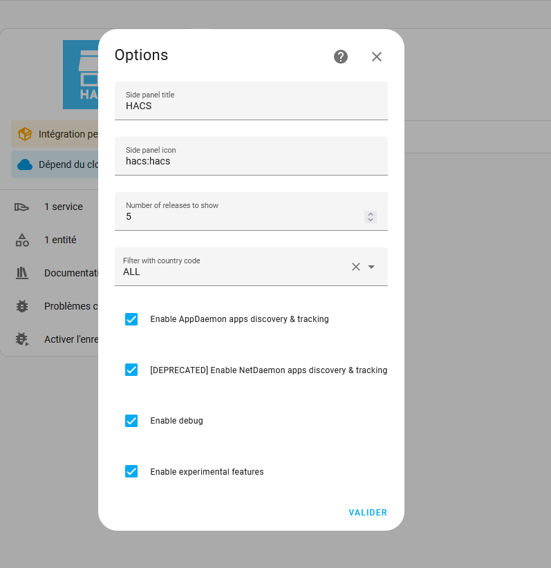 Décoche Enable experimental features et [DEPRECATED] Enable NeyDaemon apps discovery & tracking, cliques sur VALIDER et ensuite sur HACS dans le menu de gauche
