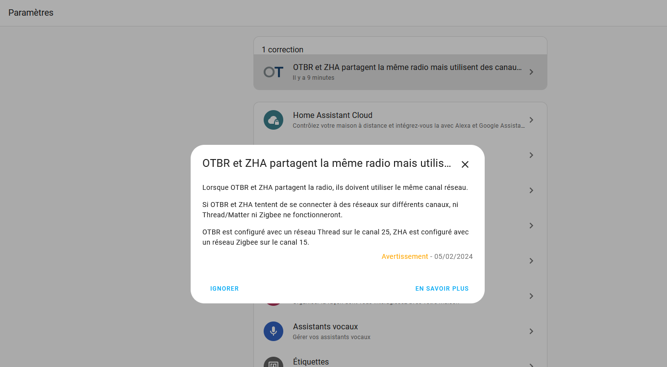 Pour le problème OTBR, il faudra changer son canal et le mettre sur le même que zha, sinon, tu devras réappairer tous tes appareils zigbee sur zha. Cependant, le canal 25 est mieux pour éviter les interférences avec le wifi