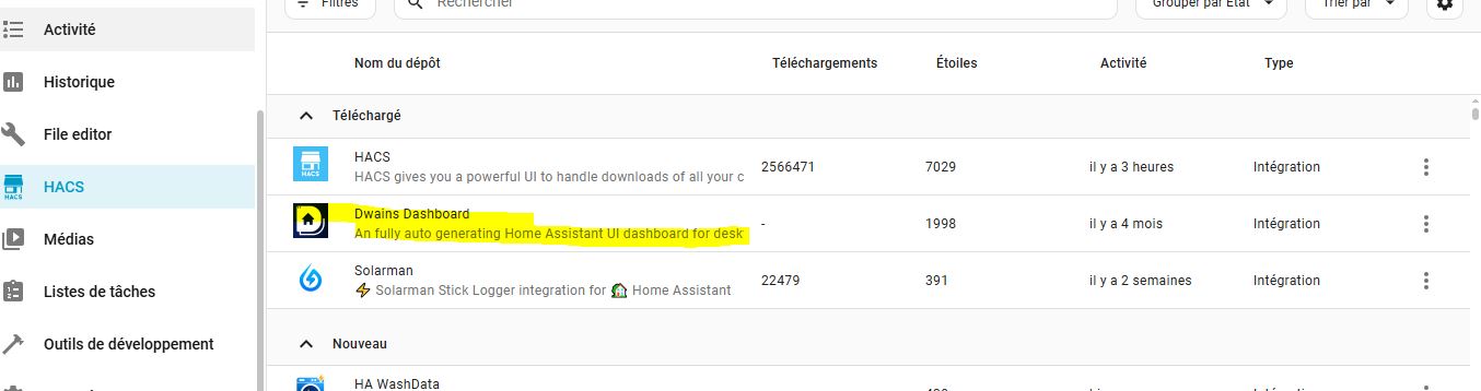 il faut supprimer l’intégration, dans paramètres/appareil et services. Après dans HACS, tu cliques sur l’intégration Dwains Dashboard, puis les 3 points et désinstaller.