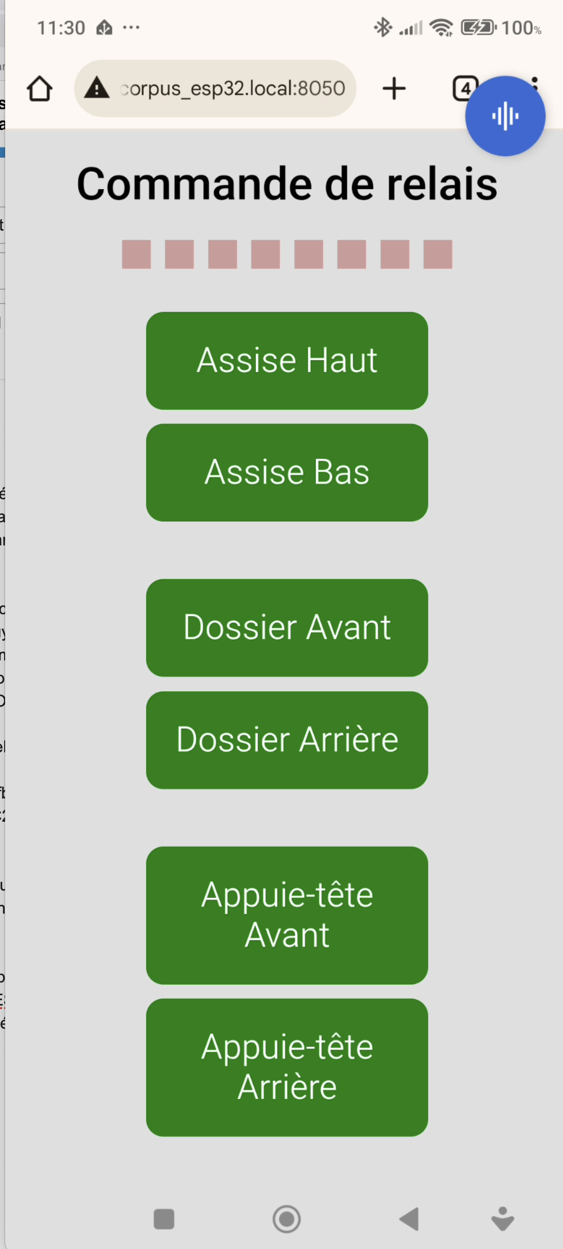 À partir de là avec un petit programme accessible en local avec un server WEB http://f5_corpus_esp32.local:8050/, il suffit de cliquer sur la commande qui correspond à un vérin pour actionner le vérin.