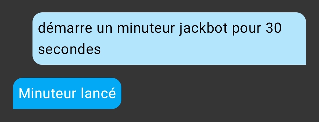 Actuellement, je m’amuse à créer des commandes vocales. Mais je suis tombé sur un os quand j’ai voulu commander un minuteur. Quand par exemple je prononce :