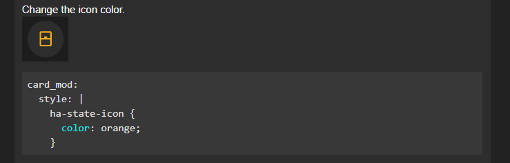 Mais hélas, comme tu as mis le doigt dans l’engrenage, tu vas bientôt aussi demander à modifier la couleur de fond de l’icone… et là il va falloir que tu ailles voir dans les liens qu’on t’a mis plus haut pour trouver tout seul quelle valeur il faut modifier avec card_mod… Indice ça risque de ressembler à…