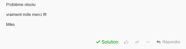 @mike413muo ce que @btncrd essaie de te dire c’est que la solution ne sert pas qu’à dire que tu n’as plus de problème, mais surtout à pointer sur le message qui t’as le plus aidé à résoudre le problème.