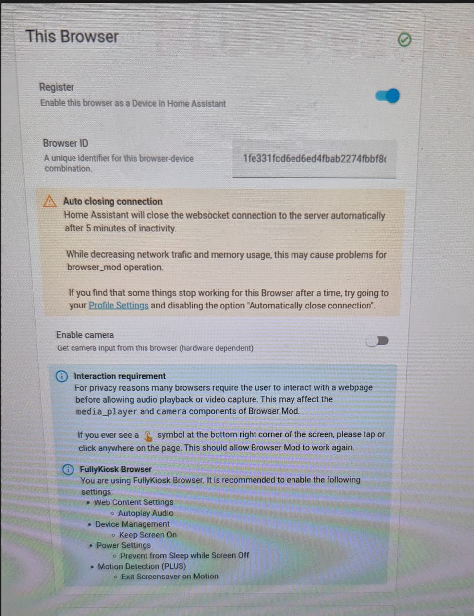 C’est sur l’appareil lui-même qui faut enregistrer browser_mod. Quand c’est fais, tu recharges la page fully-kisok sur la tablette et tu devrais avoir l’icone qui apparait en bas a droite.
