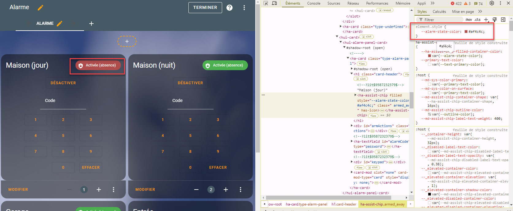 Je voudrais customiser la couleur du badge en haut à droite du panneau d’alarme car je ne trouve pas ça parlant donc je voudrais en changer la couleur : rouge quand armé, vert quand désarmé.