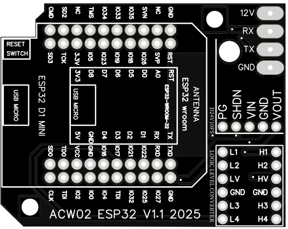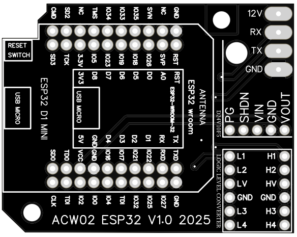 J’ai également créé un PCB pour ESP32 D1 MINI WROOM 32 (il y a 2 version du PCB) pour simplifier le montage ainsi que des fichiers 3D pour le boîtier :