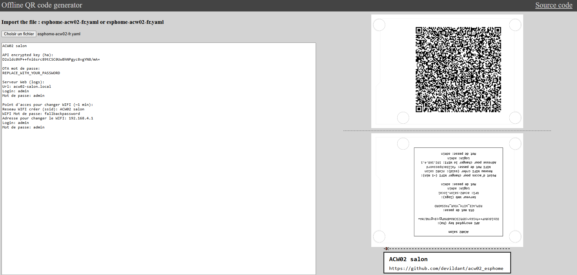 En complément, je fournis un générateur de QRCODE (le qrcode est générer a partir du yaml choisi), afin de l’imprimer et le placer sur le module en cas d’oublie des identifiants