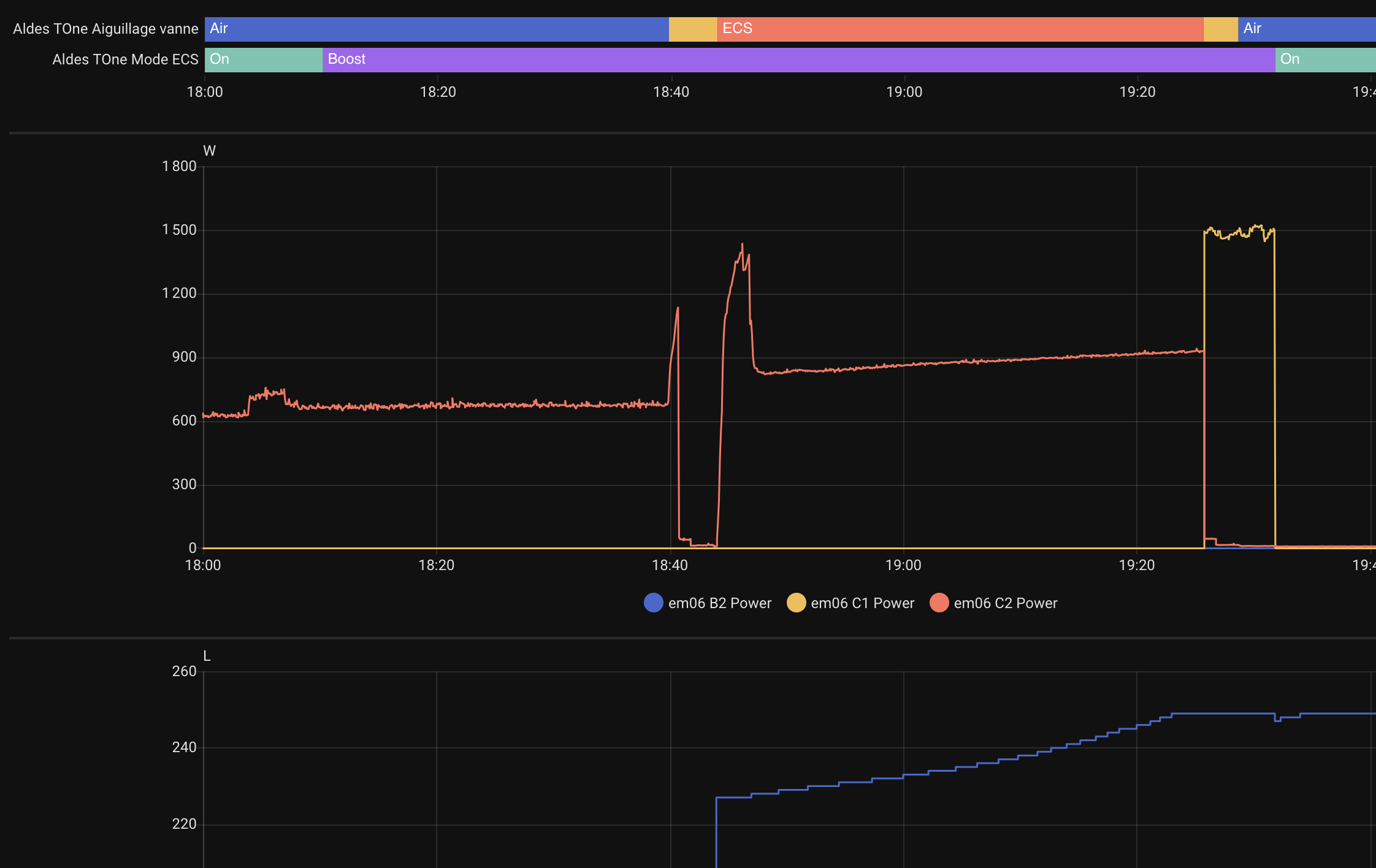 Le mode boost ce comporte comme à la normale, compresseur qui chauffe tout le long et sur la fin la résistance électrique. Par contre, mise en chauffe de l’eau 30 min après l’avoir demandé, avec le chauffage en route