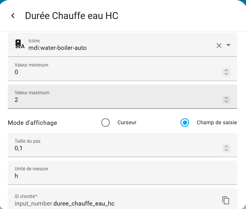 j’ai une automatisation qui récupère à 20H30, la valeur du capteur, sachant la durée de fonctionnement minimum quotidienne du chauffe eau (1h30), je fais la difference entre la durée minimum et la durée du jour, si le réultat est négatif, je mets 0, si c’est positif j’indique la valeur à 0,5 pret (soit une 1/2H) et je la copie dans un input_number