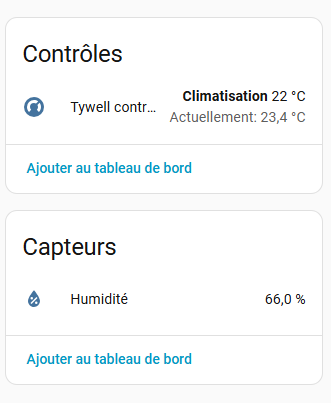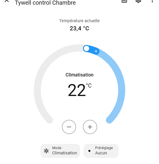 Actuellement dans ce que j’ai fait je contrôle le récepteur PAC au lieu du tywell Control. J’ai beau envoyé une consigne elle n’est pas pris en compte… Mais j’ai bien mes valeurs de thermostat, hygro, consigne qui remonte dans HA.