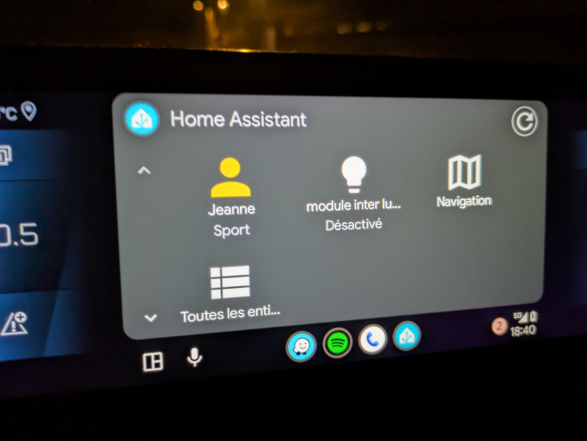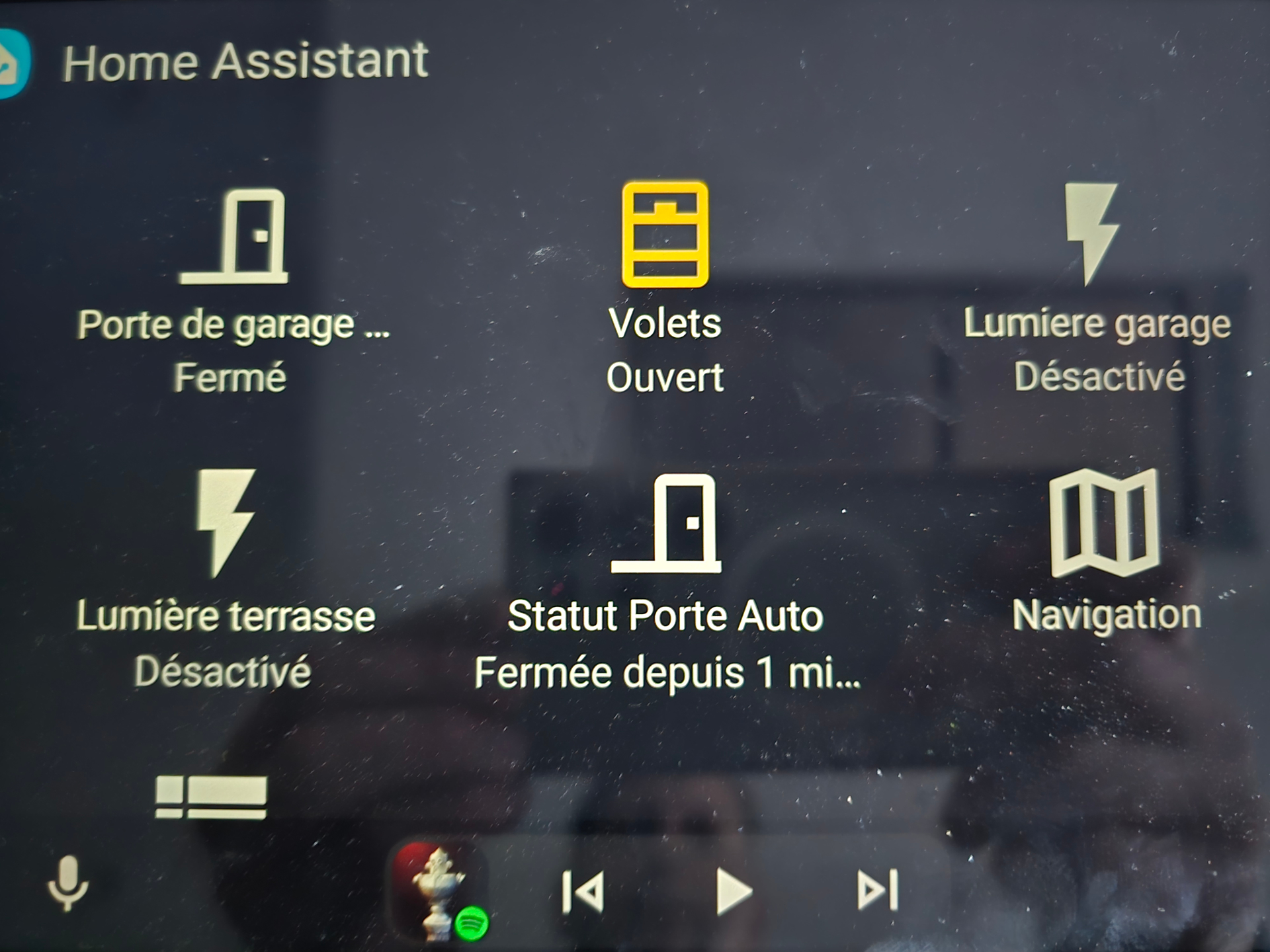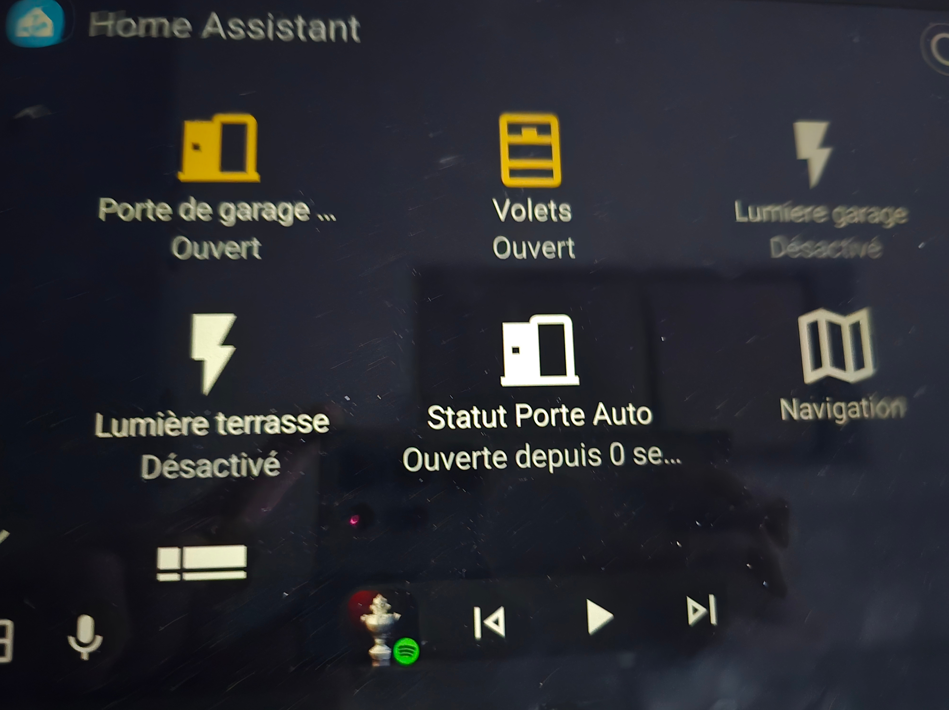 Je commence à me servir de plus en plus de home assistant depuis Android auto, notamment pour allumer la lumière du garage en arrivant par clique sur l’écran, ou encore pour savoir si la porte de garage est bien fermé.