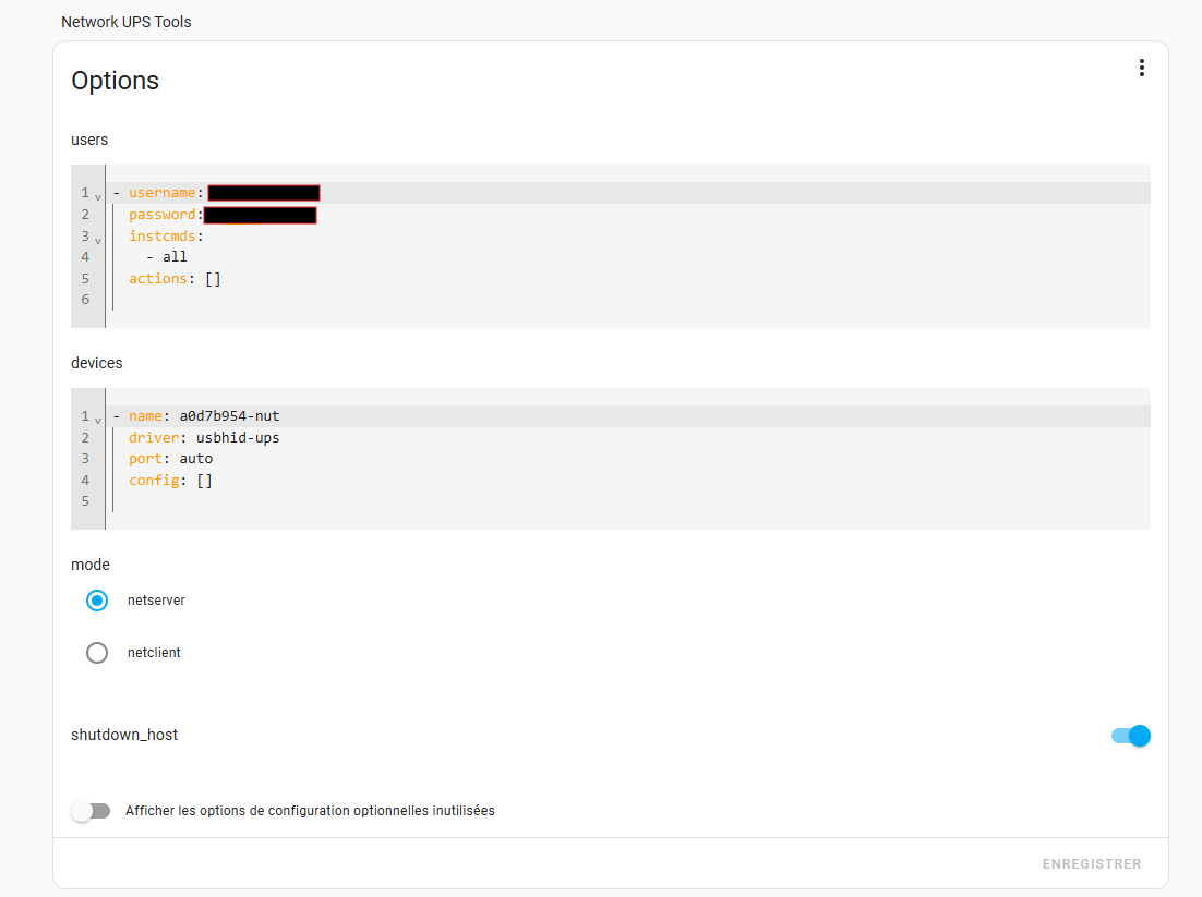 L’add-on à l’air de bien démarrer dans un premier temps, mais dans les logs que tu partages as-tu d’autres lignes qui apparaissent après la dernière de ta capture d’écran (« Starting the UPS information server… ») ?