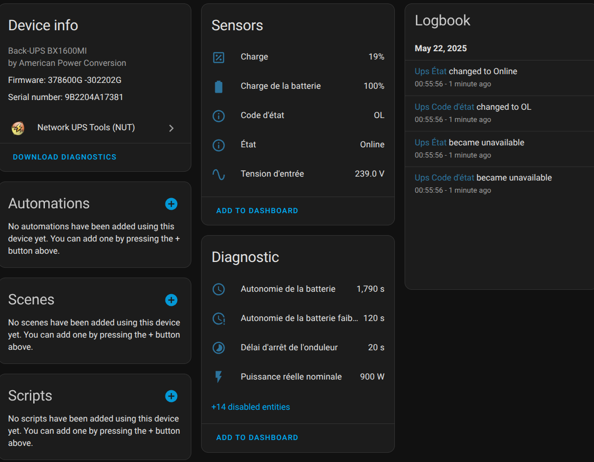 @arnaud1976 As-tu redémarré complètement ton Raspberry après voir branché l’onduleur en USB ? Je ne sais pas si c’est nécessaire mais dans le doute… .
