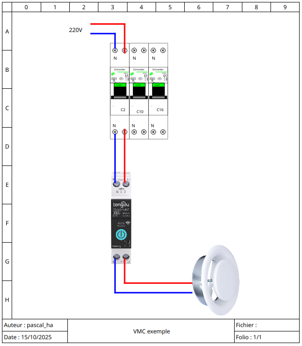 ok je n’avais pas compris que le peigne alimentait toute la ligne et effectivement j’y connais rien en électricité.J’ai appelé mon frère qui maitrise et avec ton schéma j’ai pu brancher l’interrupteur Tongou à la suite du disjoncteur de ma VMC, en faisant un “pont” entre le bas du disjoncteur et le haut du Tongou (qui n’est pas connecté au peigne). Tout fonctionne niveau électrique et c’est conforme à ton schéma. Merci