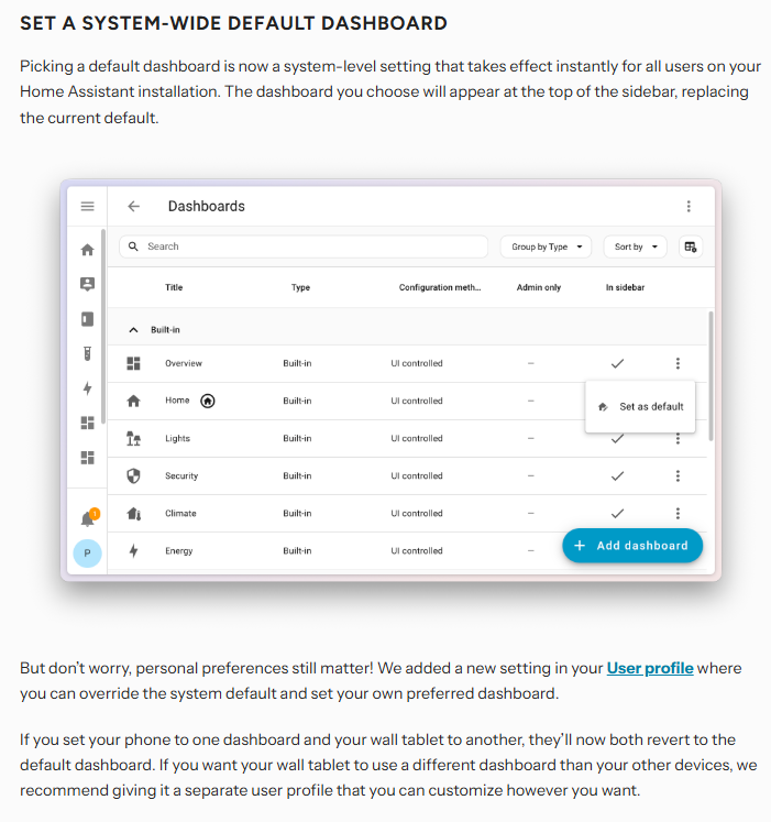 Mais un user ne peut plus définir un dashboard par défaut par device.=> Ça c’est moins bien, le contournement c’est de créer un user spécifique pour les devices spécifiques.