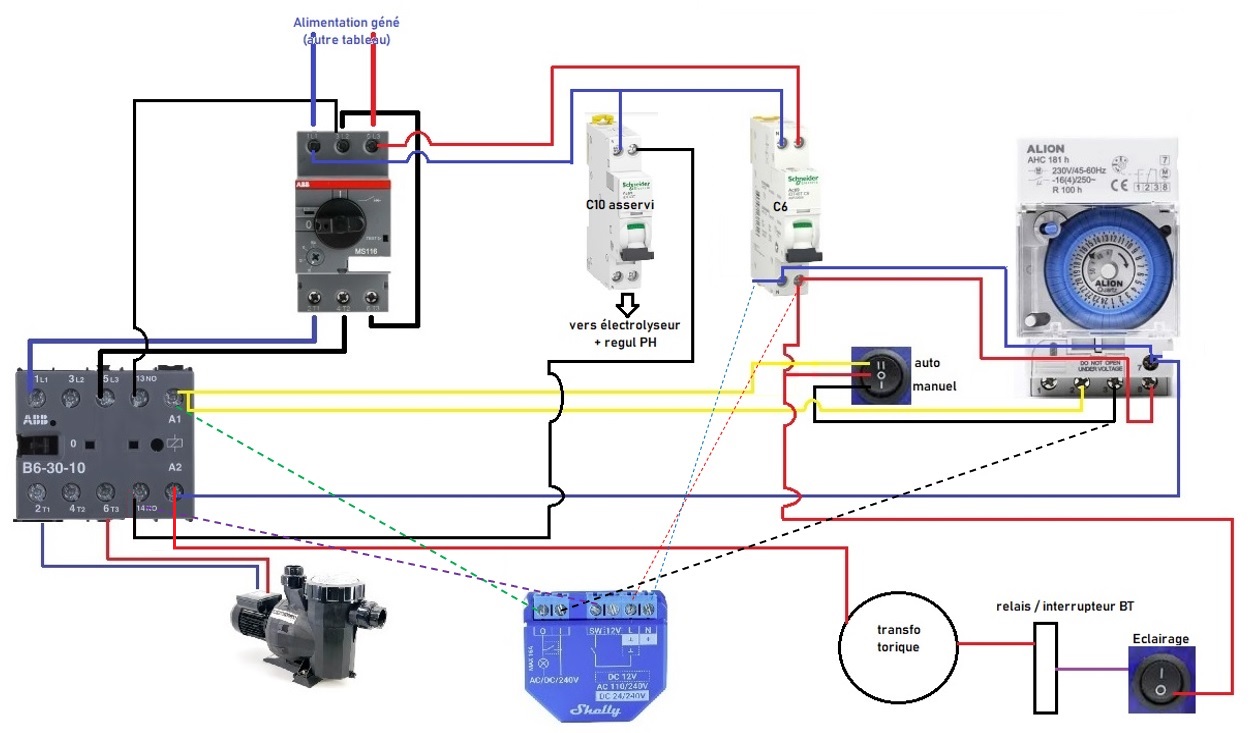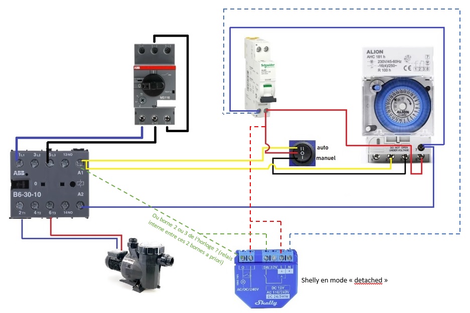 Merci à tous pour vos messages et conseils sur ce forum. A mon tour je souhaiterais pouvoir piloter ma filtration piscine avec un shelly 1 plus, en parallèle/ complément du mode manuel ou automatique existant (avec horloge programmable). Il s’agit d’un schéma simplifié mais j’aurais aimé avoir vos avis svp sur le câblage envisagé (en pointillés) car j’ai quelques doutes.