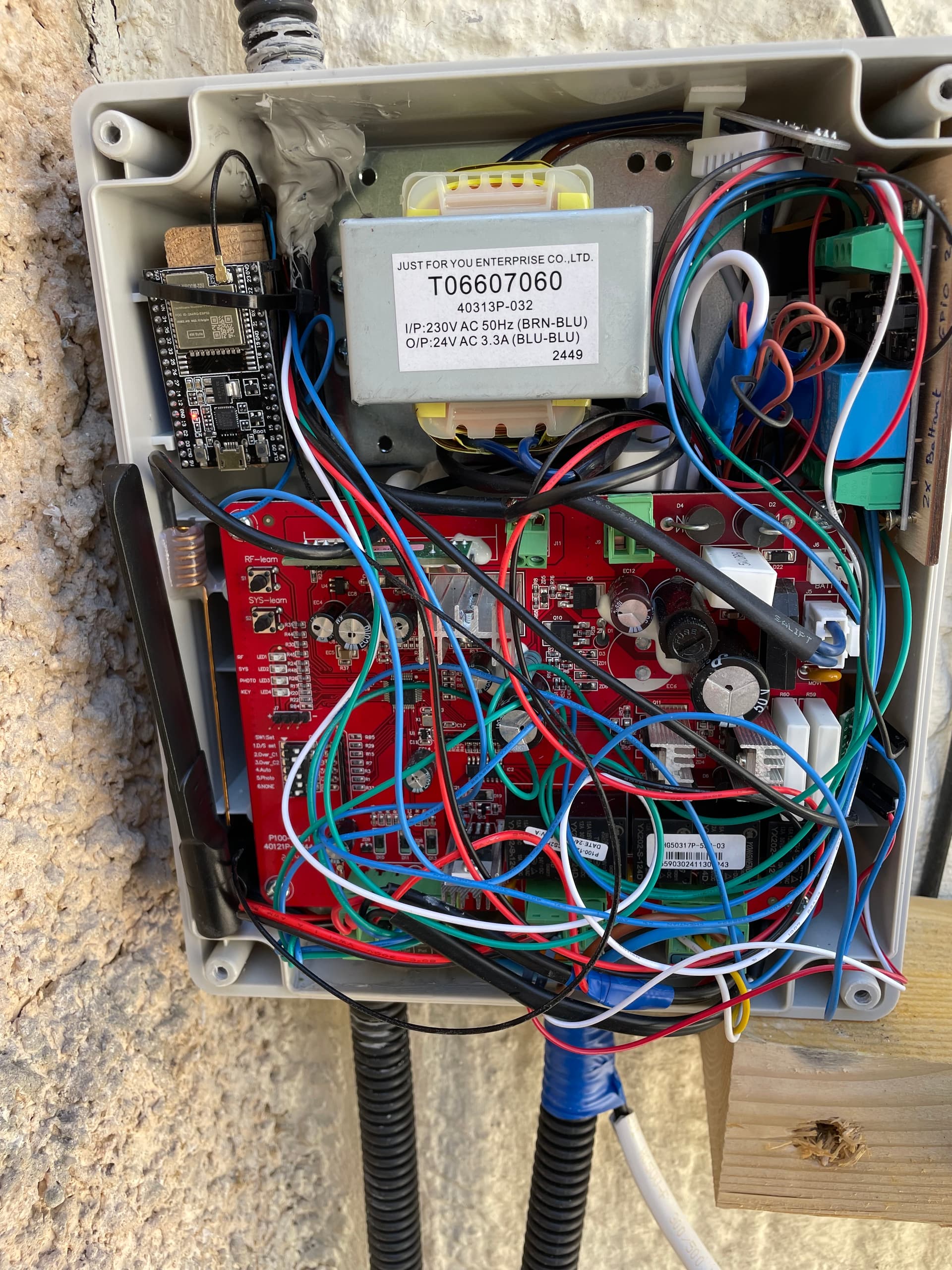 Comme beaucoup je le contrôle à l’aide de 2 modules relays reliés à un ESP32 et branchés sur les contacts sec. J’alimente le tout par un petit transfo usb d’un viel iPhone(j’avais commencé par prendre les 5v sur le port série la carte PCB100 mais mes relais tiraient trop de courant).