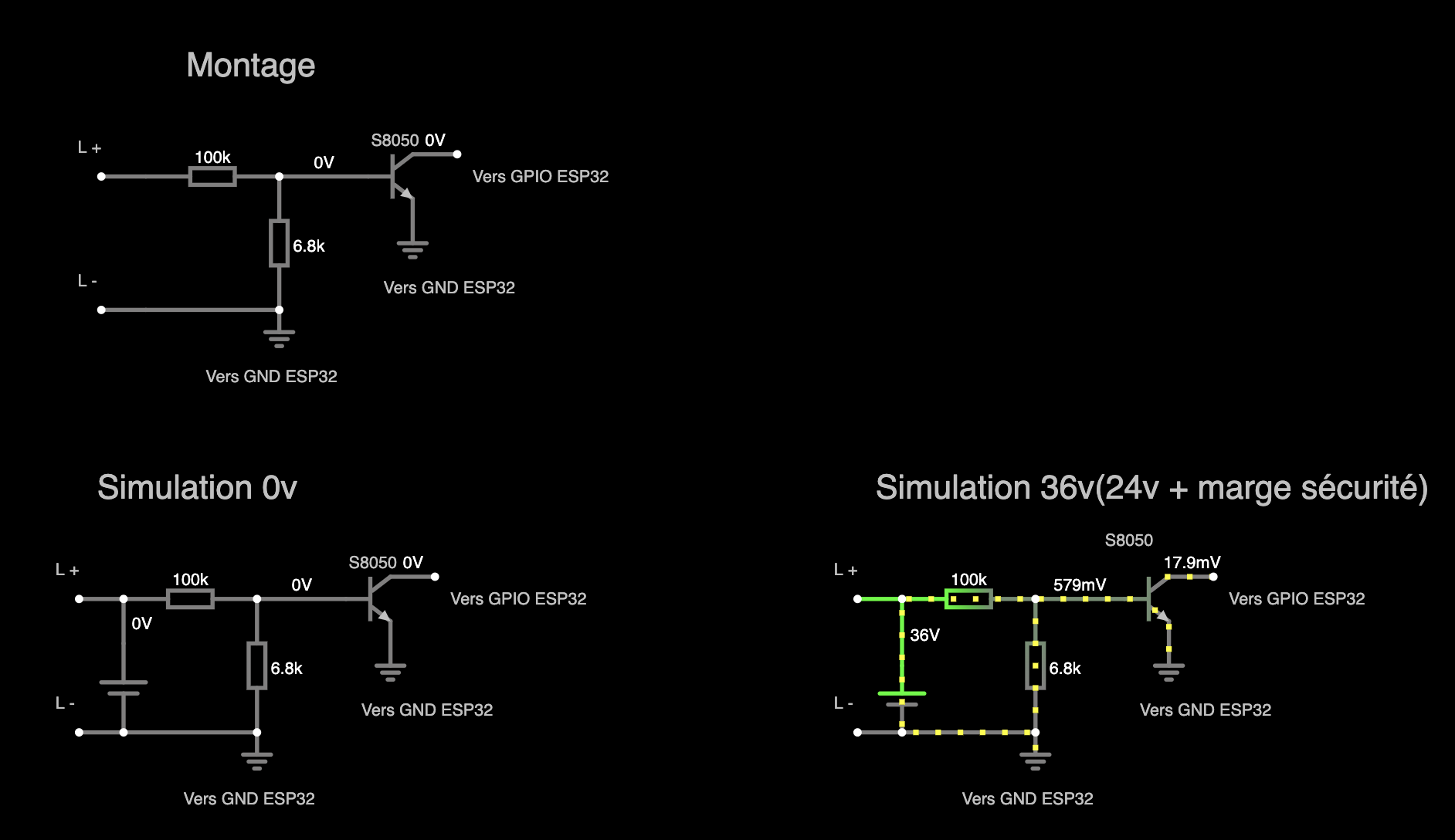 J’ai dimensionné mon réducteur de tension pour réduire jusqu’à 36V en étant toujours très en dessous des 3.3v max de la logique de l’ESP32.