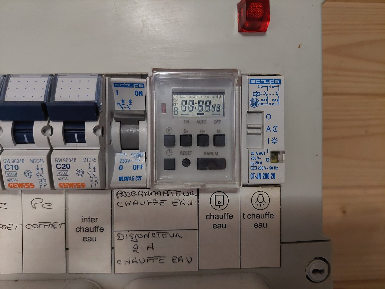 Bon, je suis un peu embêté : en regardant plus attentivement derrière mon chauffe eau, j’ai remarqué qu’il était directement connecté au tableau électrique sans intermédiaire. Le fil électrique va du chauffe eau directement sur le disjoncteur (cf photo). Du coup, je ne peux pas utiliser ce genre d’interrupteur j’imagine et je dois prendre directement par un disjoncteur connecté?