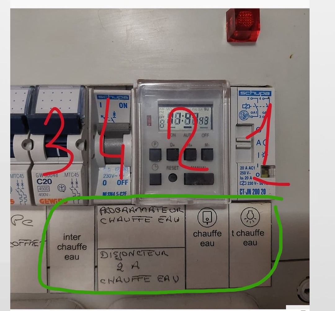 Sur ton tableau, tu as plusieurs éléments qui me font dire que ton ballon n’est pas raccordé en direct sur le disjoncteur de protection (3), mais qu’il passe aussi par le contacteur de puissance (1).