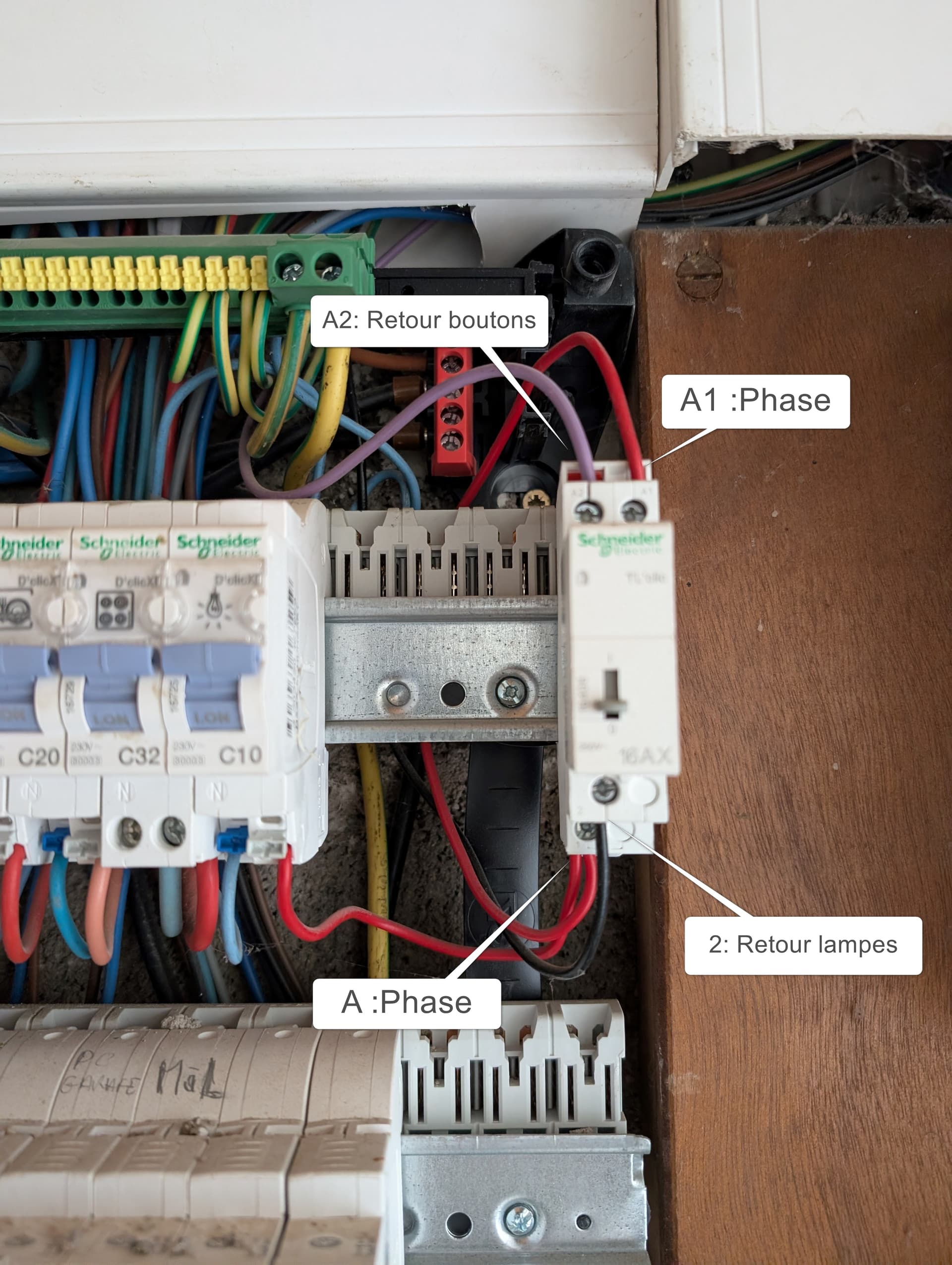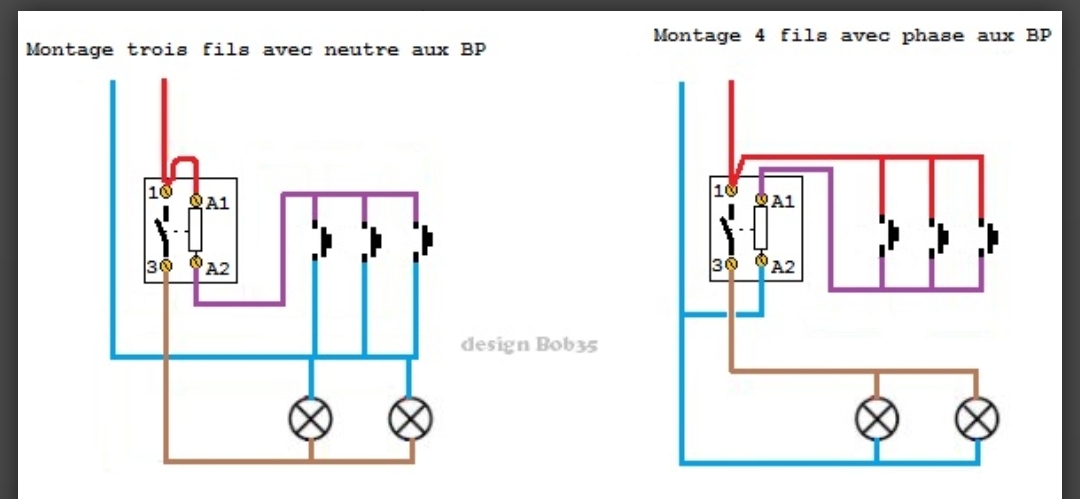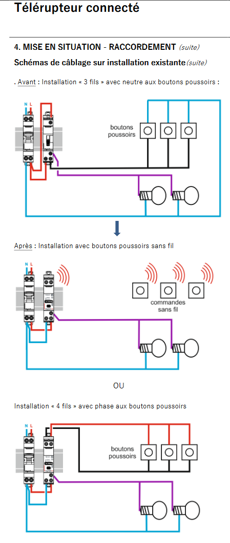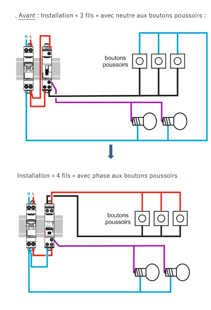 Mais en regardant les schémas de la notice LEGRAND, j’ai un doute d’inversion entre le noir qui serai peut-être le retour lampes et le violet retour boutons. Je regarderai au niveau d’un inter et d’une lampe voire la couleur des câbles. Dans tous les cas ça ne change pas la problématique.