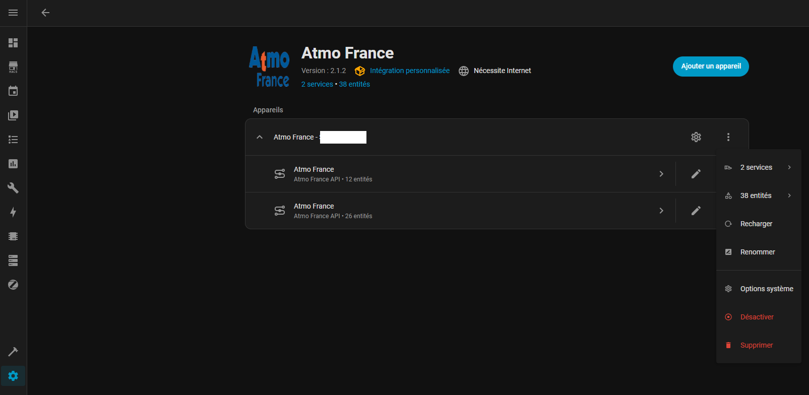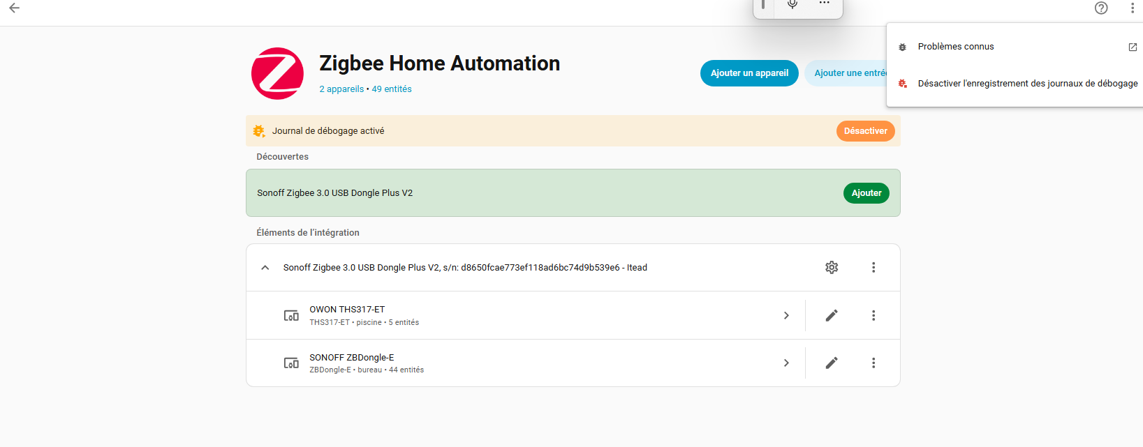 Hello ddfdom je me permets de revenir vers toi. Mon pb de ZHA et Z2MQTT est bien résolu et mes capteurs fonctionne désroamis bien mais j’avais enore une question . Est-il normal que je n’aie toujours pas de menu déroulant dans la barre … du menu Appareils et services. Et du coup je ne peux mener aucune action alors que je suis identifié comme propriétaire. Est-ce la migration de Proxmox peut avoir perturbé quelquechose (ou pas); Voici ce que j’ai à la place du menu déroulant en haut à droite. Merci d’avance