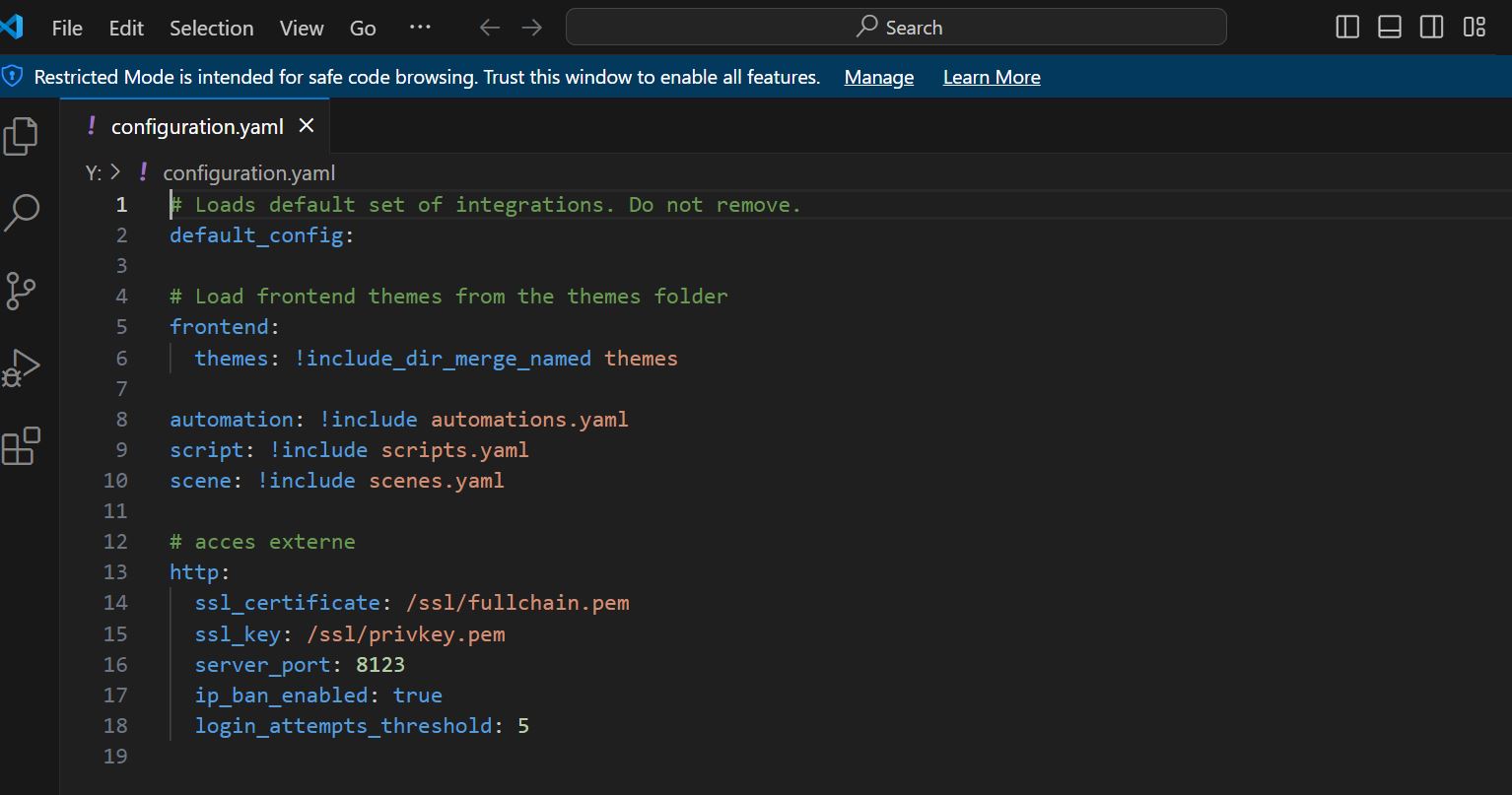 Je n’ai pas pour l’instant activé l’ip_ban_enabled: dans les lignes qu’il fallait copier. Je le ferai dans la semaine quand j’aurai bien étudié cela avec la vidéo YouTube d’ArminasTV dans laquelle il traitre de Duckdns et de l’authentification multi-facteurs.