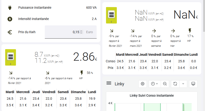 2022-03-22 16:09:41.288761 - DEBUG : MQTT Send : homeassistant/sensor/enedisgateway/123456789/attributes => {"numPDL": "123456789", "activationDate": "2013-11-30", "lastUpdate": "2022-03-22T16:09:41Z", "timeLastCall": "2022-03-22T16:09:41Z", "yesterdayDate": "2022-03-21", "yesterday": 0.0, "yesterdayLastYearDate": "2021-03-22", "yesterdayLastYear": 27.034, "last_week": 140631, "daily": ["0.0", "25.8", "23.36", "21.97", "23.42", "21.57", "24.49"], "current_week": -1, "day_1": "0.0", "day_2": "25.8", "day_3": "23.36", "day_4": "21.97", "day_5": "23.42", "day_6": "21.57", "day_7": "24.49", "current_week_last_year": "52.22", "last_month": 649.237, "current_month": "476.47", "current_month_last_year": "553.16", "last_month_last_year": "709.81", "last_year": 7504.651000000001, "current_year": "2084.43", "current_year_last_year": "2283.57", "dailyweek": ["2022-03-21", "2022-03-20", "2022-03-19", "2022-03-18", "2022-03-17", "2022-03-16", "2022-03-15"], "dailyweek_cost": ["0", "3.5999999999999996", "3.23", "3.12", "3.32", "3.1100000000000003", "3.4899999999999998"], "dailyweek_costHP": [0, "2.09", "1.8", "2.0", "2.09", "2.12", "2.28"], "dailyweek_HP": [0, "12.86", "11.06", "12.27", "12.84", "13.03", "14.01"], "day_1_HP": 0, "day_2_HP": 25734, "day_3_HP": 22130, "day_4_HP": 24550, "day_5_HP": 25682, "day_6_HP": 26074, "day_7_HP": 28032, "dailyweek_costHC": [0, "1.51", "1.43", "1.12", "1.23", "0.99", "1.21"], "dailyweek_HC": [0, "12.79", "12.09", "9.5", "10.39", "8.36", "10.28"], "day_1_HC": 0, "day_2_HC": 25584, "day_3_HC": 24198, "day_4_HC": 19014, "day_5_HC": 20788, "day_6_HC": 16736, "day_7_HC": 20568, "peak_offpeak_percent": 17.14, "monthly_evolution": -8.53, "current_week_evolution": 0, "current_month_evolution": -13.86, "yesterday_evolution": 0, "friendly_name": "EnedisGateway.123456789", "errorLastCall": "", "errorLastCallInterne": "", "current_week_number": 12, "offpeak_hours_enedis": 0, "offpeak_hours": 0, "subscribed_power": "9 kVA"}