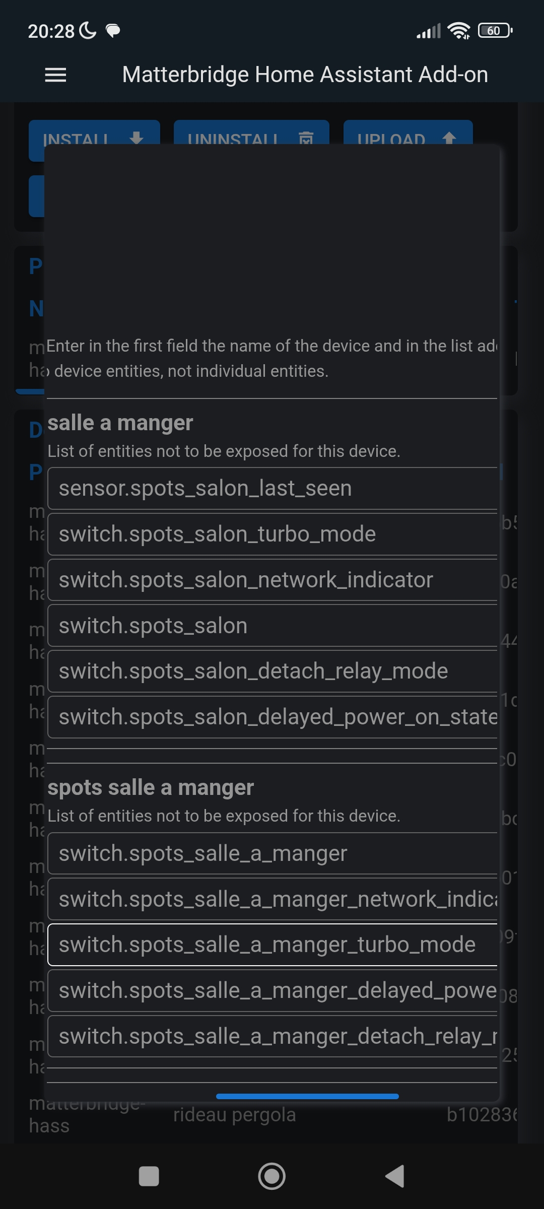 dans matterbridge j ai bien creer une liste par module des entités a ne pas exposés , j ai redemarrer l addon , redemarrer HA mais sa ne prend pas en compte les reglages . la liste est bien presente mais tout est encore exposée .