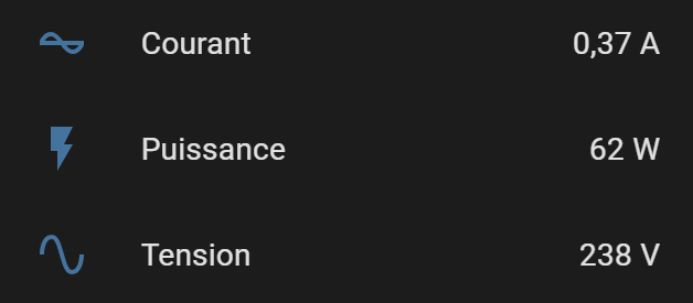 Mon problème est que hier pendant que je faisait fonctionner un appareil branché sur une prise connecté Nous A1Z j’ai regardé sa puissance et elle me paraissait fausse. A l’aide de la tension et du courant j’ai vite fais le calcul et compris que ma tension est fausse, encore maintenant comme vu ci dessous avec le courant et la tension (0,37x238 = 88W).