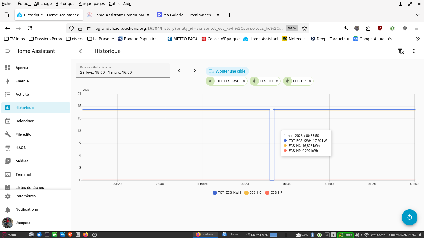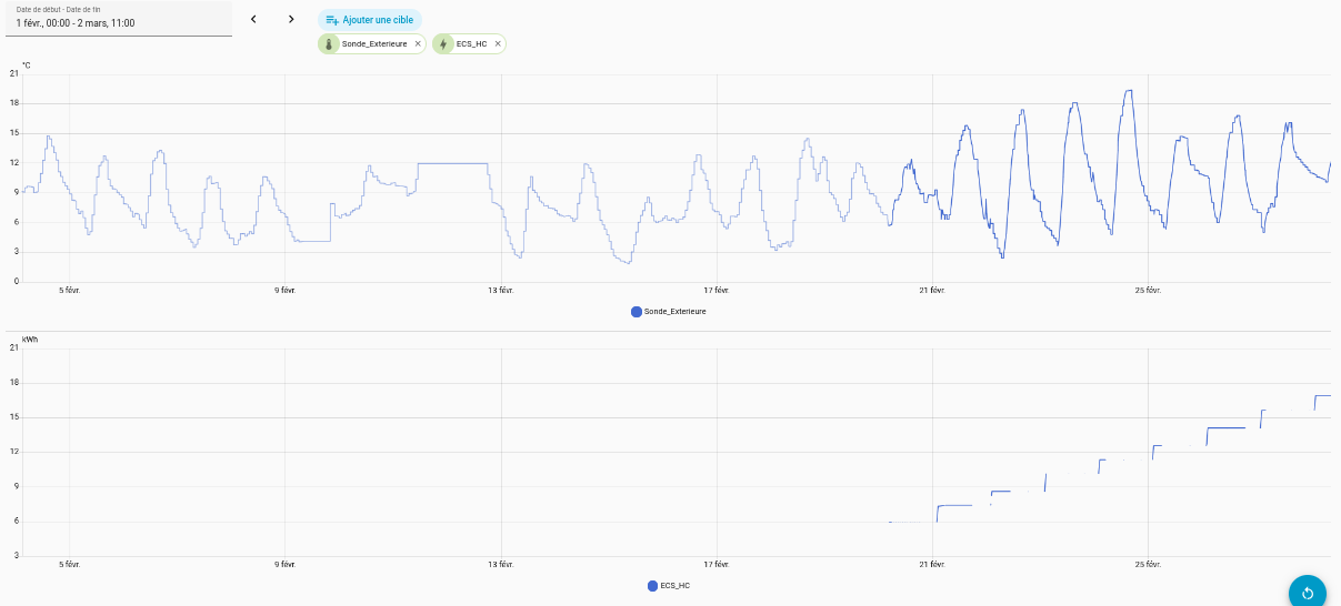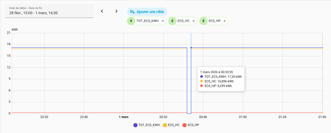 via zigbee ( ESP32C6 soft maison) , je récupère 4 valeurs qui sont la consommation en kwh de ma PAC soit en mode chauffage soit en mode ECS et pour chacun des cas , en Heure Creuse ou en Heure Pleine. les recorders sont faits sur un template qui somme les 2 valeurs.