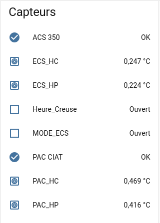 J’ai réalisé une centrale d’acquisition de données avec un ESP32C6 qui rapatrie via Zigbee des valeurs numériques ( entre autres) sur HA : compteur énergie HC/HP sur 2 Modes de fonctionnement d’une PAC Chauffage et ECS. il y a donc 4 valeurs distinctes.