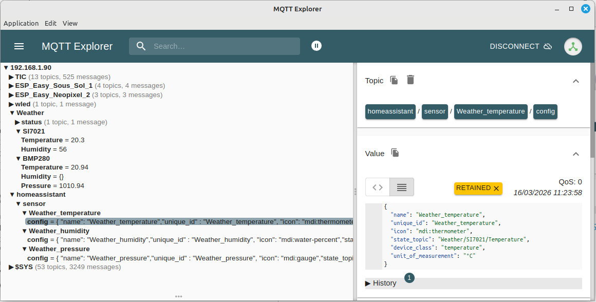 Vérification avec MQTT Explorer (Connecté au MQTT Mosquito de Home Assistant):
