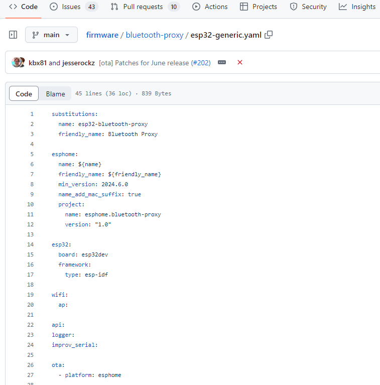 dans le YAML du bluetooth proxy. Car ca récupère pas sur le fichier source ( packages ) la configue du ota.