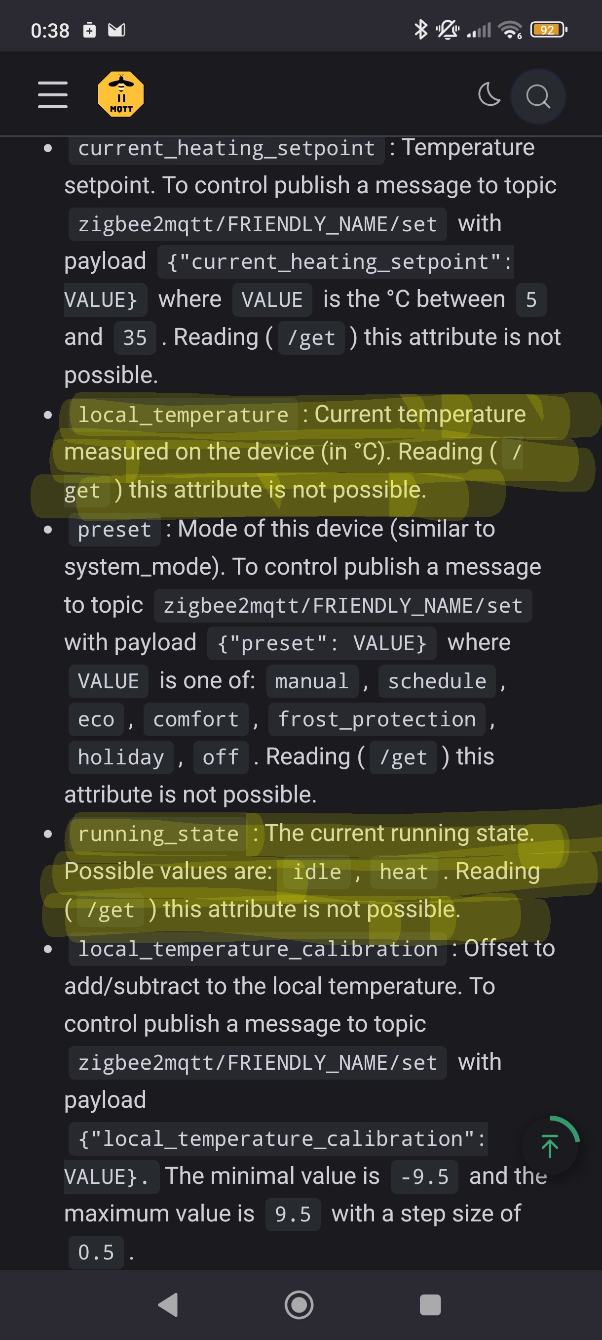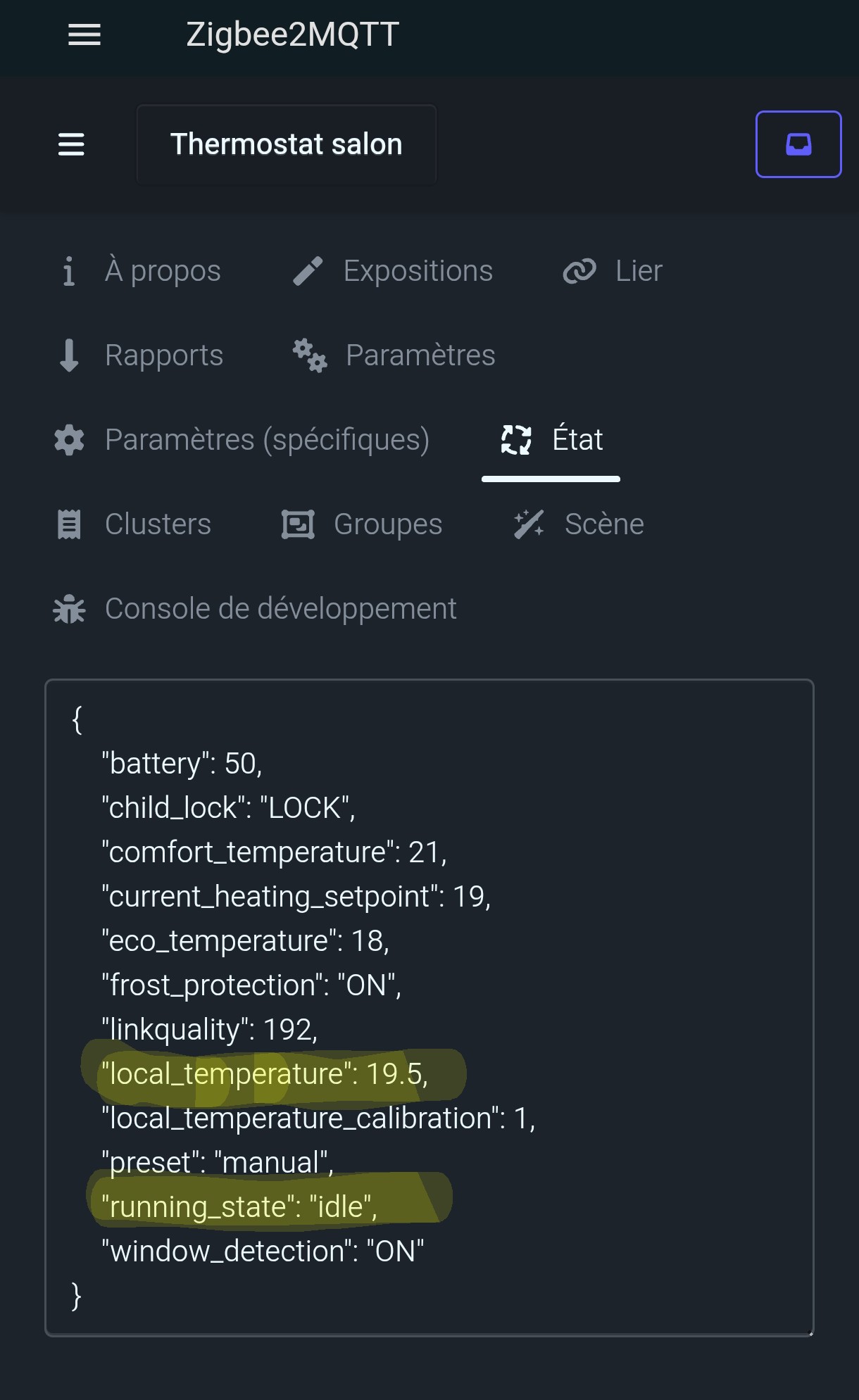Là où je bloque, c’est que pour mon projet je souhaite récupérer l’état de la tête thermostatique « running_state: idle | heat », ainsi que la température du capteur de la tête thermostatique local_temperature, mais elles ne sont pas disponibles dans ma liste des déclencheurs quand je veux créer un automatisme. Ce qui m’intrigue, c’est que d’après la doc Z2M, faire un get sur ces valeurs ne serait pas possible sur ce modèle de tête thermostatique, d’après ce que j’ai compris, alors qu’elles remontent bien lorsque je consulte l’etat de l’appareil.