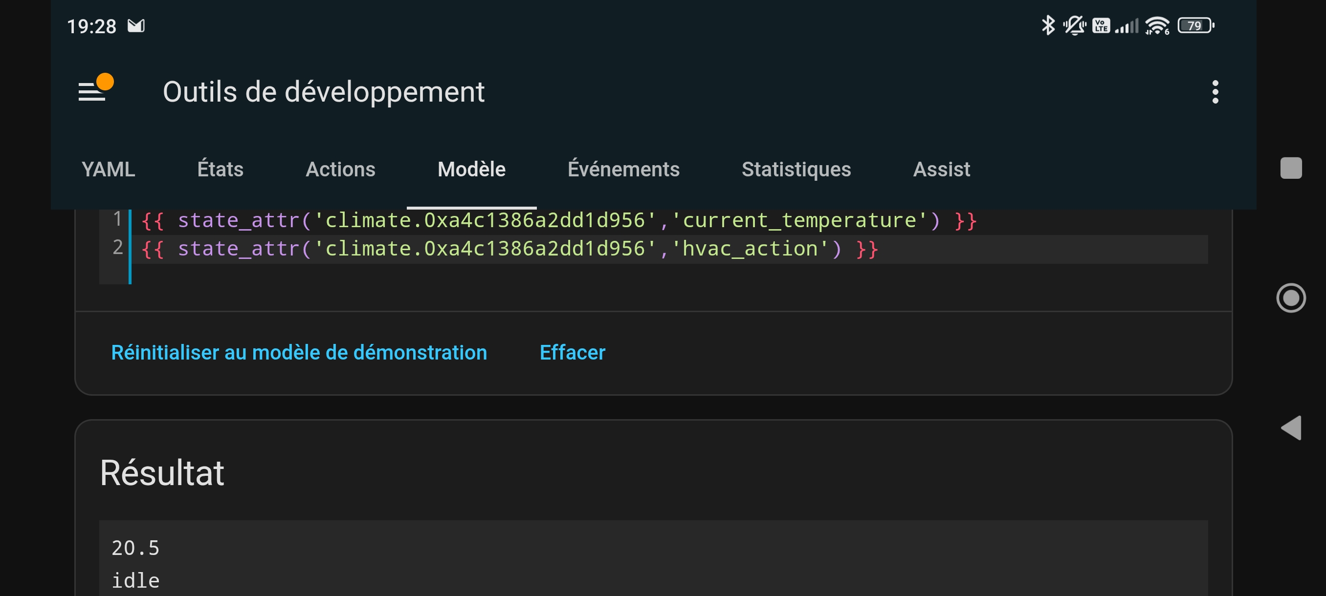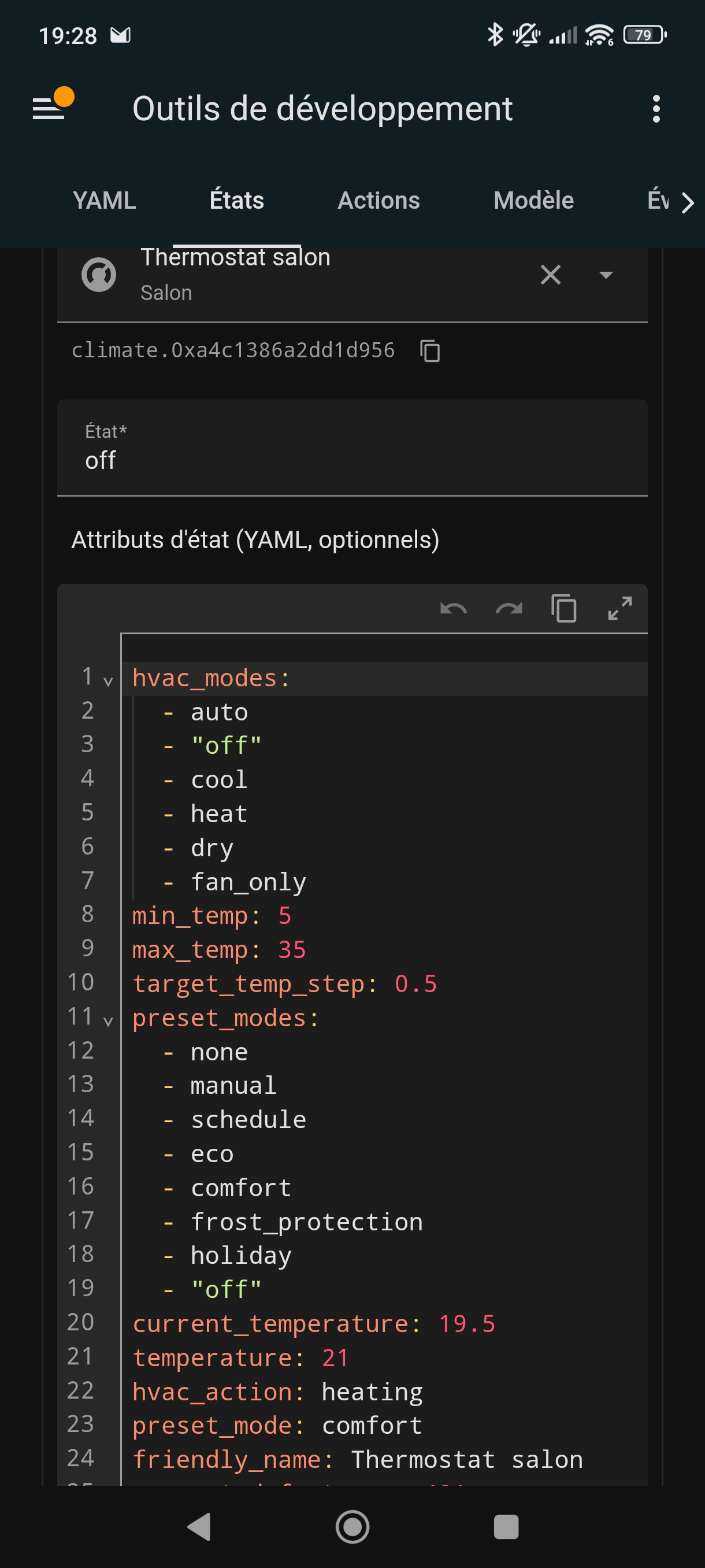 Effectivement, en passant par l’état de Thermostat salon dans les outils de développement, je retrouve bien l’entité “climate.0xa4c1386a2dd1d956” qui propose des valeurs, dont celles que je souhaite récupérer :