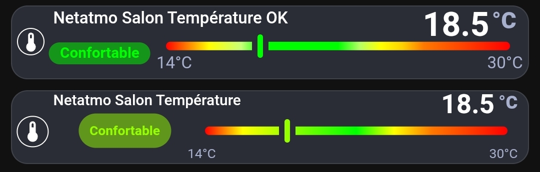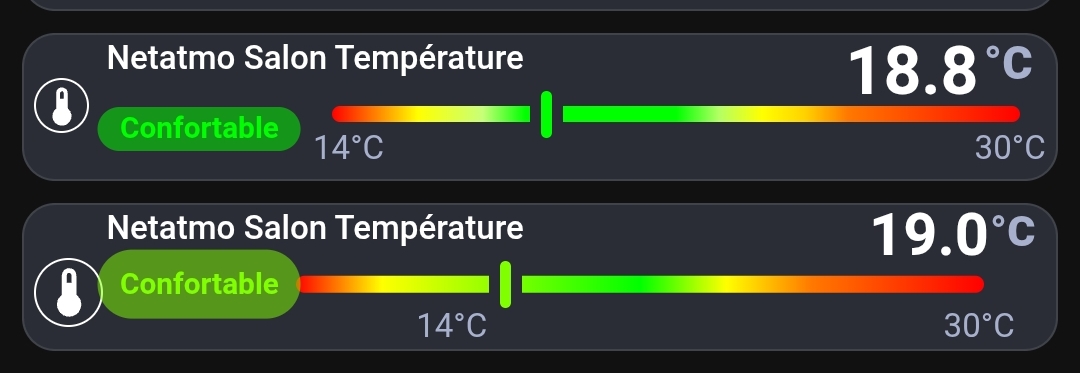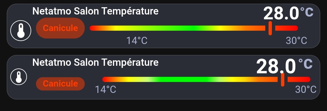 Il fallait prendre en compte que le delta de température est passé de 16°C (30° - 14°) à 30°C et donc chaque degré ne représente plus 6.25% de la longueur de la barre. Il faudra ajuster les pourcentages pour le dégradé linéaire car du coup « Confortable » est en orange.