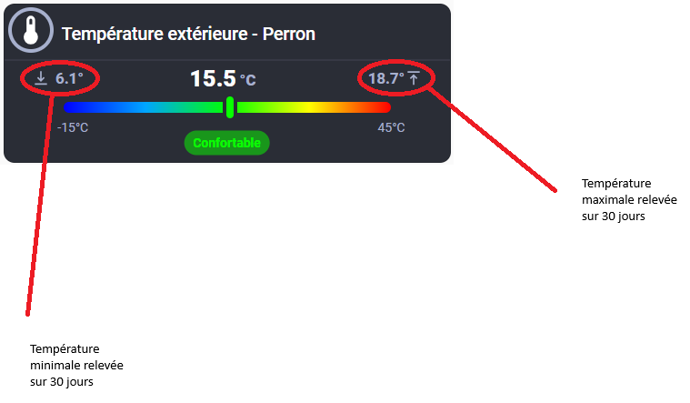 Je trouve cela très réussi, je suggère une amélioration : ajouter la valeur min et max du jour pour le capteur considéré :