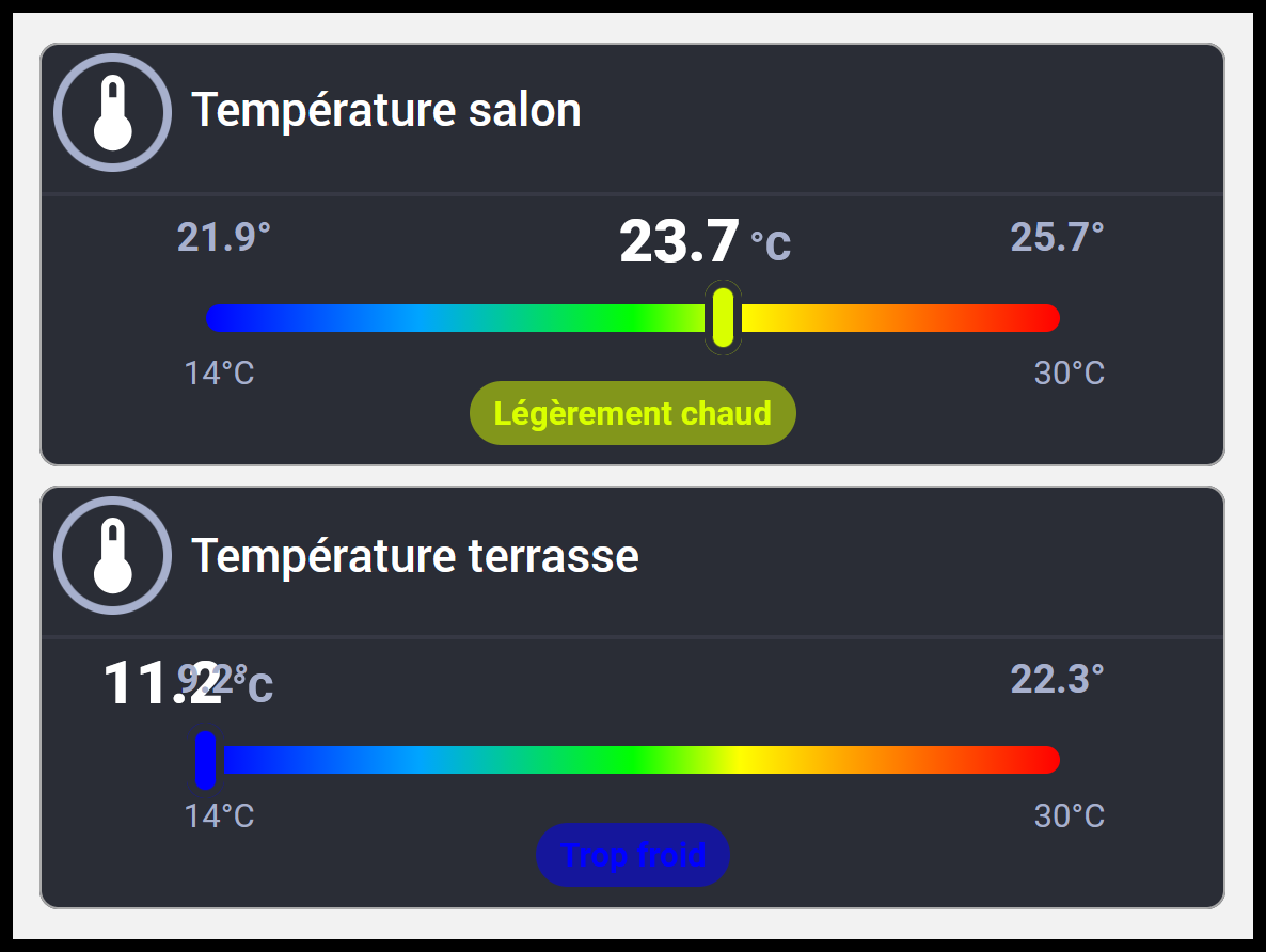 Il suffit d’avoir un sensor qui récupère ces valeurs et de mettre dans le code de la carte « Radon » les custom_fields « min_temp_week » et « max_temp_week » (après le avoir renommés) :
