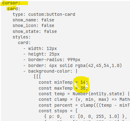 Le plus simple est de reprendre le code de la carte « Température intérieure » posté en 53/128 et d’y mettre tes capteurs, tu auras ainsi une structure correcte car là, en collant à la suite les blocs concernant les valeurs minimales et maximales, çe n’ira pas (tu n’as pas la position des deux nouveaux custom_fields dans les styles)