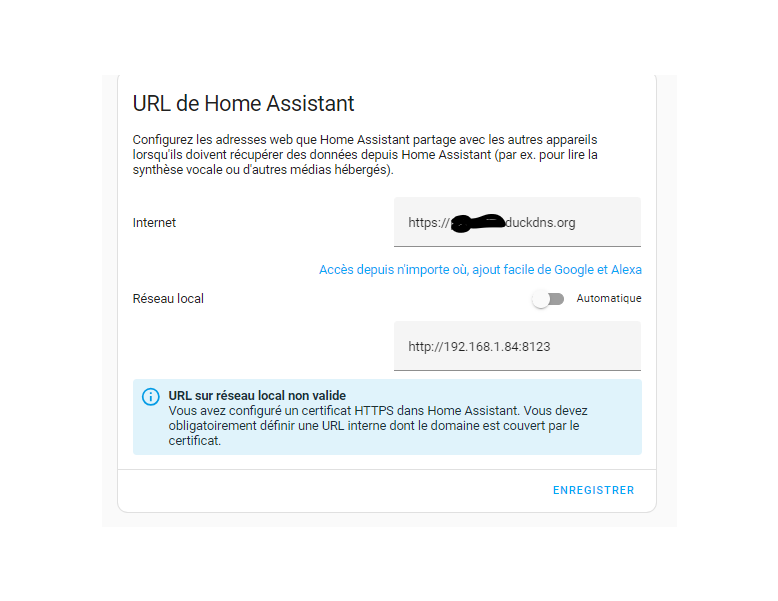 Je pense que le problème vient de la sécurité HTTPS (via duckdns pour moi) car le message d’erreur d’accès à la ressource :