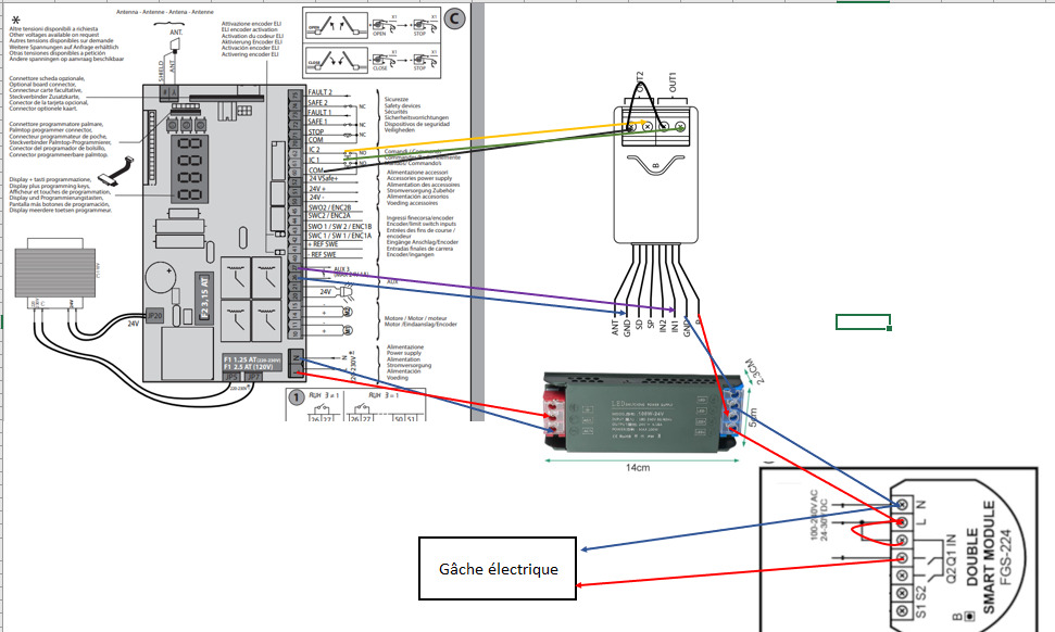 Mise en service aujourd’hui, le cablâge ci-dessus est plus ou moins ok: l’ouverture piéton fonctionne, l’ouverture totale aussi, et la gâche du portillon également.