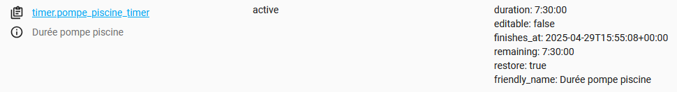 Je te recommande cependant une modification. Intéresse toi au timer pour remplacer le delay. Actuellement, ton automatisation va attendre parfois plusieurs heures pour éteindre ta pompe. Si entre temps tu as du redémarrer HA (MAJ ou coupure de courant) ta pompe ne sera éteinte que le lendemain. Le timer, contrairement au delay, est conservé au redémarrage ce qui assure l’extinction de la pompe.